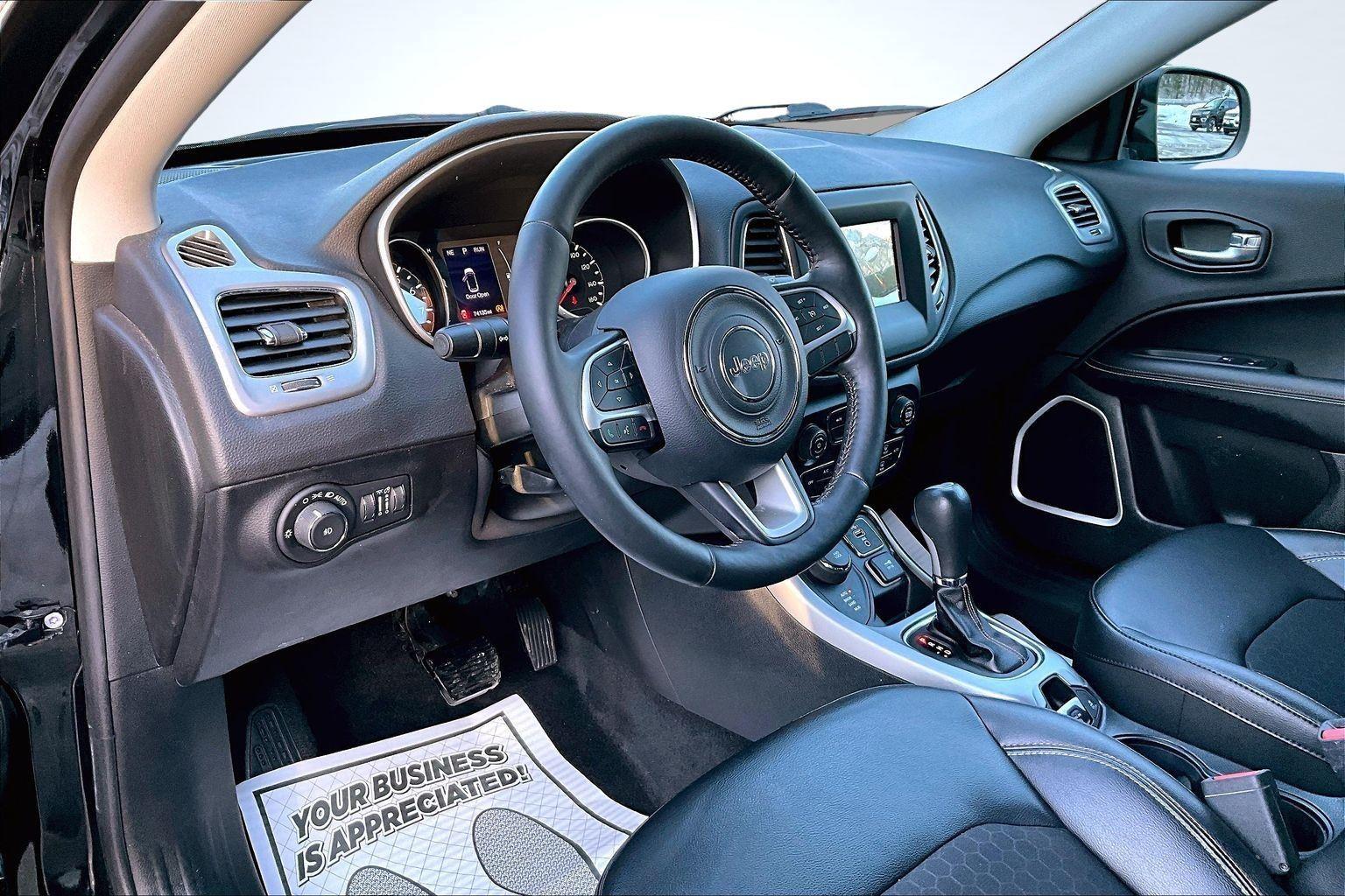This 2019 Jeep Compass Latitude offered in Diamond Black Crystal Pearlcoat will make a great addition to your family or business! Here are just a few features this vehicle has to offer:nCold Weather Group ($945 value)Heated Front SeatsWindshield Wiper De-IcerHeated Steering WheelRemote Start SystemnComfort Heated steering wheel - A warm touch. Trying to drive with bulky winter gloves on isn't always easy. Keep your hands warm in cold temperatures so you can ditch the mitts and get a firm grip with this heated steering wheel. Heated driver and front passenger seat cushions - That's hot. Heated driver and front passenger seat cushions provide more targeted warmth so you can get comfortable quicker in cold weather. If you have lower body pain, you might also be soothed by the heat while you drive. No matter the weather, find comfort in heated driver and front passenger seat cushions.Convenience Keyfob engine start control - Get an early start. Remotely start your vehicle's engine from the key fob, ensuring your ride is ready to go when you get in. Now you can stay comfortable inside while your vehicle gets comfortable outside, thanks to Keyfob engine start control.Technology and Telematics Smart device mirroring - Smartphone, meet smart car. You can control your device through your vehicle's infotainment system. Smart device mirroring brings together safety and convenience by making it easier to find what you're looking for while keeping your eyes on the road. Wireless connectivity - Strike the cord. Wireless technology makes it easy to place calls without having to fumble with your phone. It integrates your device with the system inside your vehicle for hands-free access. Keep connected and keep your hands on the wheel with wireless connectivity. This vehicle comes with a 30-day, 1250 mile 100% warranty that covers not only the complete list of state of Maine inspection standards but also engine & drive train as well. We also offer extended warranties for an additional fee. nnPlease call 207-753-0033 and speak with Dan, Ryan or Chris for further details or email us at sales@lakecityexports.com. nnAlso ask us about our AMAZING NEW GAP program! Buy Gap Coverage through us and if your vehicle becomes a total loss, we will give you $1000 towards the purchase of a new vehicle here at Lake City Exports! DISCLAIMER: Vehicle may or may not have equipment/options listed due to the fact that it is computer generated when VIN # is entered into the system and is listed with ALL options available within that package but this does not actually mean this vehicle may be equipped with it.