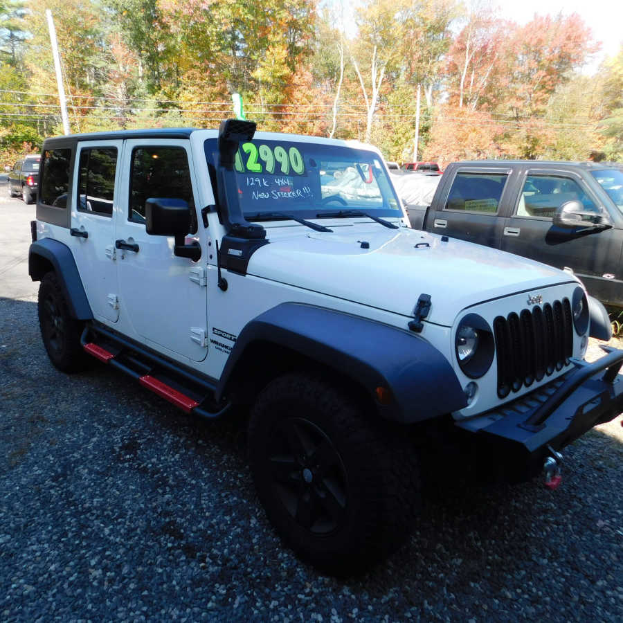 2015 Jeep Wrangler - Unlimited - Sport package, 129k miles, 4x4, sound bar, hard top, Aftermarket stereo system with back up camera, blue tooth, steering mounted controls. Aftermarket front bumper with push guard, running boards, rear bumper, snorkel, detachable roof panels, AC and so many other options...The previous owner spent thousands of dollars making this just the way she wanted it....It is a very cool Jeep. it is all through the shop with all service work being done.....This Jeep just took a brand new state inspection sticker and it is ready to roll !!!!!! This Jeep is being sold for $12,990......Way below book value......Fun vehicle to own all year round...........................................................M & M used cars is your 1 stop place to shop where the price is ALWAYS RIGHT !!!! We are located @ 1316 Carl Broggi Hwy in Lebanon, Me....Office hours are Mon-Fri 9-6...Sat 9-2.....See all of our inventory @ MMWICKEDGOODCARS.COM....We also have about 20 + cars that are in the process of getting ready at all times, so if you do not see what you like on our website, come on in and we might just have exactly what you are looking for....We sell vehicles through the shop with new state inspection sticker and 30- day temp tag, or you can buy wholesale as well......We try to carry a fine selection of cars, trucks, suv's and we even carry some classic cars also....We try our best to make EVERY customer happy, and be as fair as possible..... Give us a call now to set up a time to come see any of our vehicles @ 207-339-2195.......Remember, when you buy from M & M === We both win !!!!!!