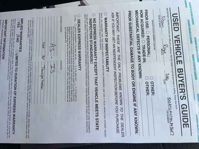 Clean CARFAX. 2.5L I4 DOHC 16V CVT with Xtronic AWD Brilliant Silver RECENT TRADE IN, ALL WHEEL DRIVE, Rogue SL AWD, 4D Sport Utility, 2.5L I4 DOHC 16V, CVT with Xtronic, AWD, Brilliant Silver, Charcoal w/Leather-Appointed Seat Trim, 18" Alloy Wheels, Blind Spot Warning, Forward Emergency Braking, Front fog lights, Heated door mirrors, Heated Front Bucket Seats, Illuminated Kick Plates, LED Headlights, Power Panoramic Moonroof, Radio: AM/FM/CD/RDS/AUX NissanConnect w/Navigation, Remote keyless entry, SL Premium Package, Splash Guards.Berlin City Toyota – Wholesale to the Public “AS-IS” Vehicle Disclosure Berlin City Toyota is pleased to offer customers the opportunity to purchase select wholesale trade-in vehicles prior to their sale at auction. A wholesale dealer license is not required to participate in this program. Please note that these vehicles are wholesale units and are not intended for retail sale. Each vehicle has undergone a Maine State “pass/fail” safety inspection. A list of any item(s) causing the vehicle to fail this inspection — thereby rendering it “unsafe for the road” — will be provided at the time of purchase. All vehicles sold under this program are sold strictly AS-IS, with no warranties, express or implied. All sales are final. The vehicle inspection sticker will be removed. Dealer financing options are not available, and no temporary registrations will be issued for AS-IS vehicles. Each AS-IS vehicle must be towed from the premises, as included in the purchase price (within 30 miles of the dealership), to the buyer’s desired destination. Berlin City Toyota assumes no responsibility for the vehicle’s mechanical or physical condition once it has left dealership property. A dealer documentation fee, title fee, and applicable sales tax will be collected at the time of sale.