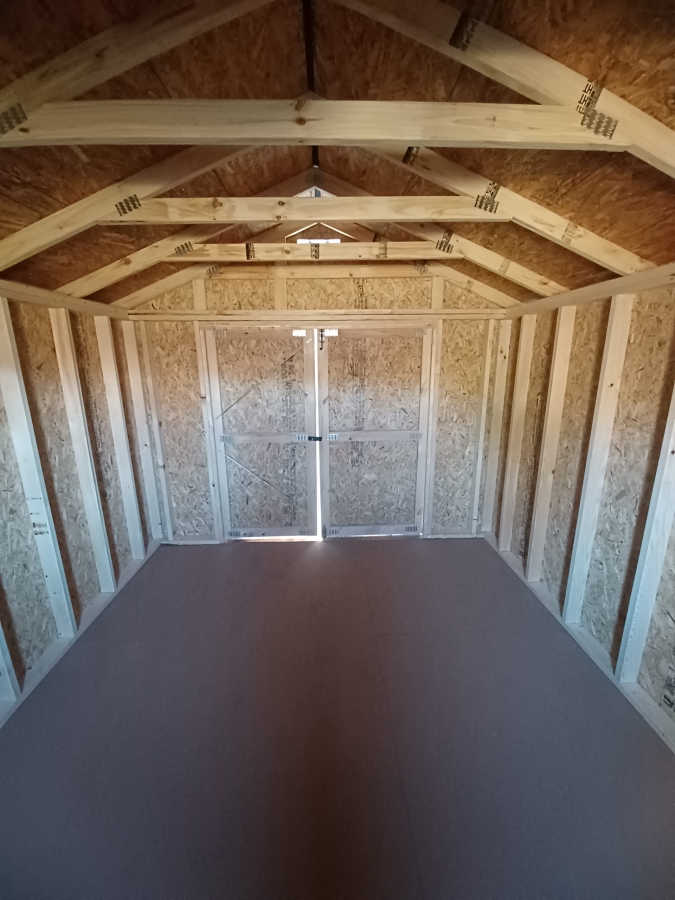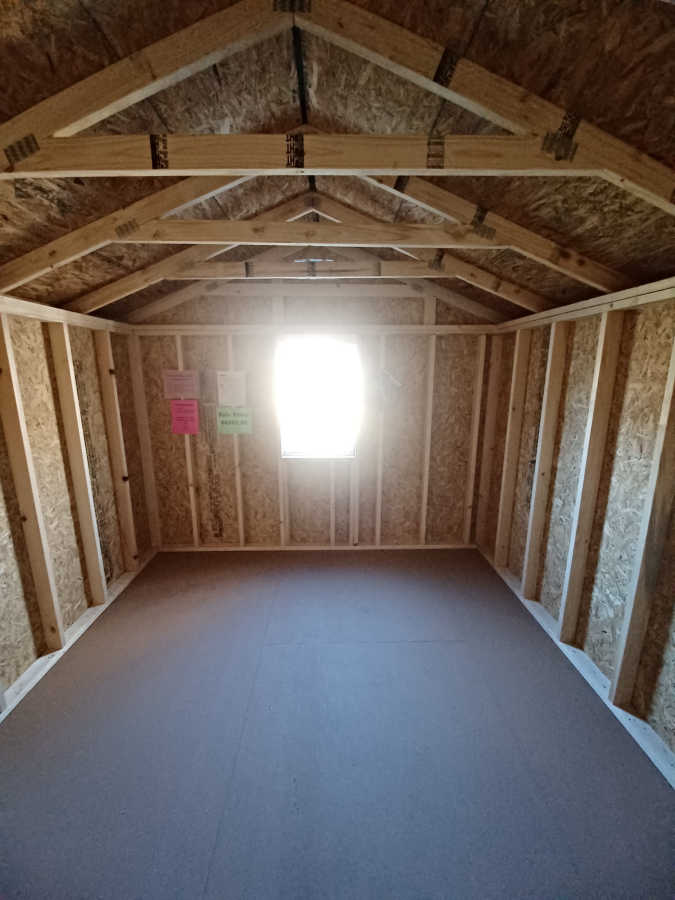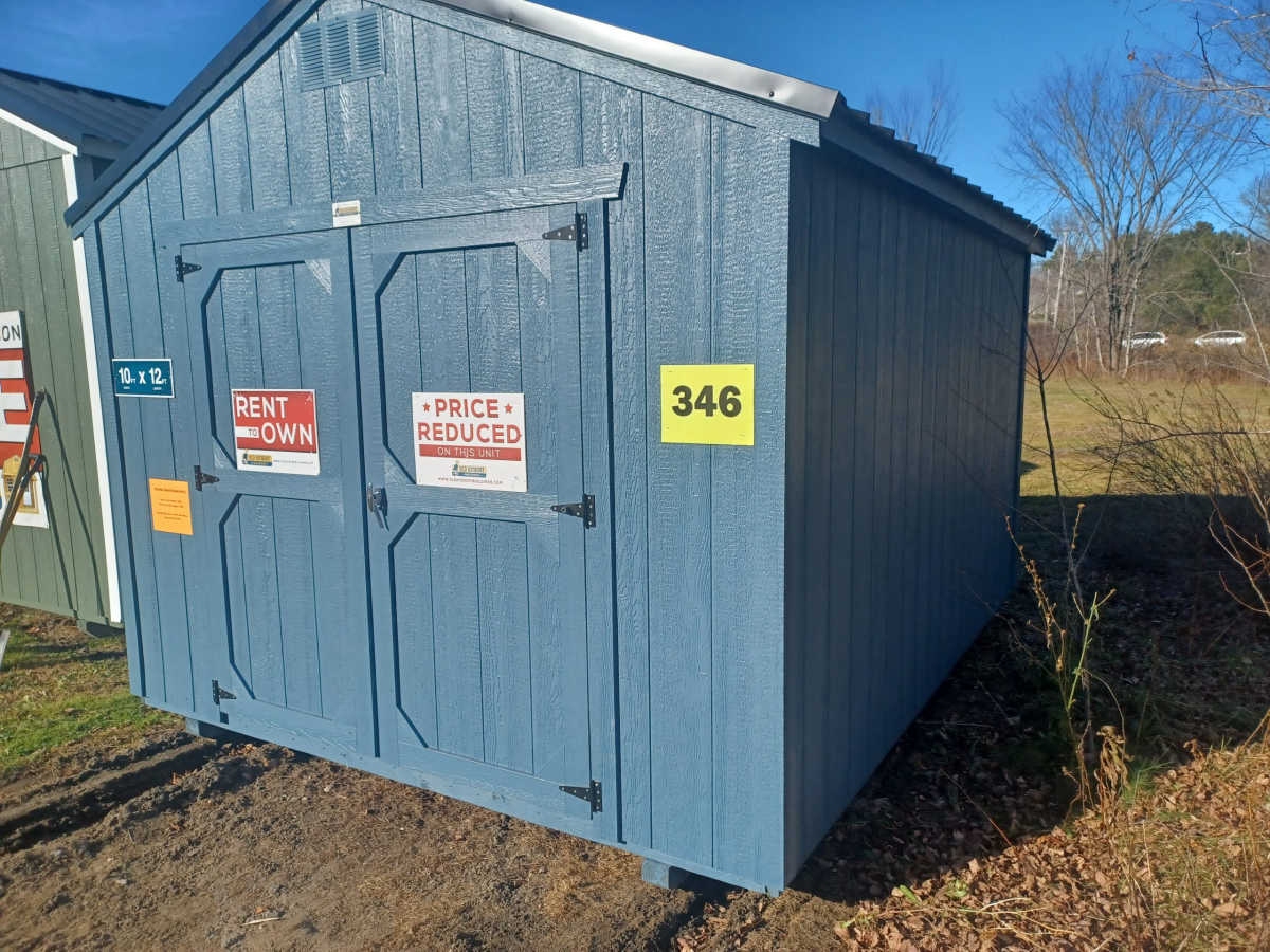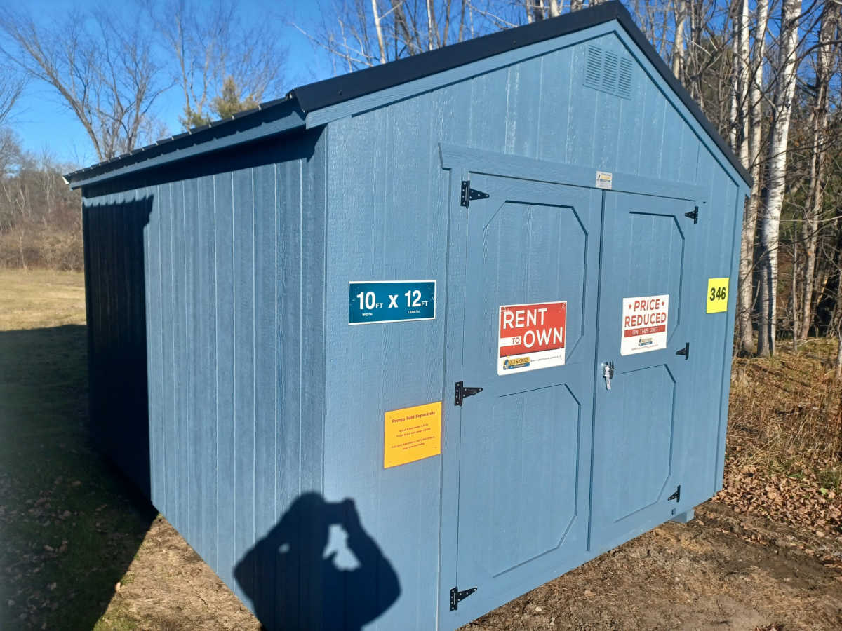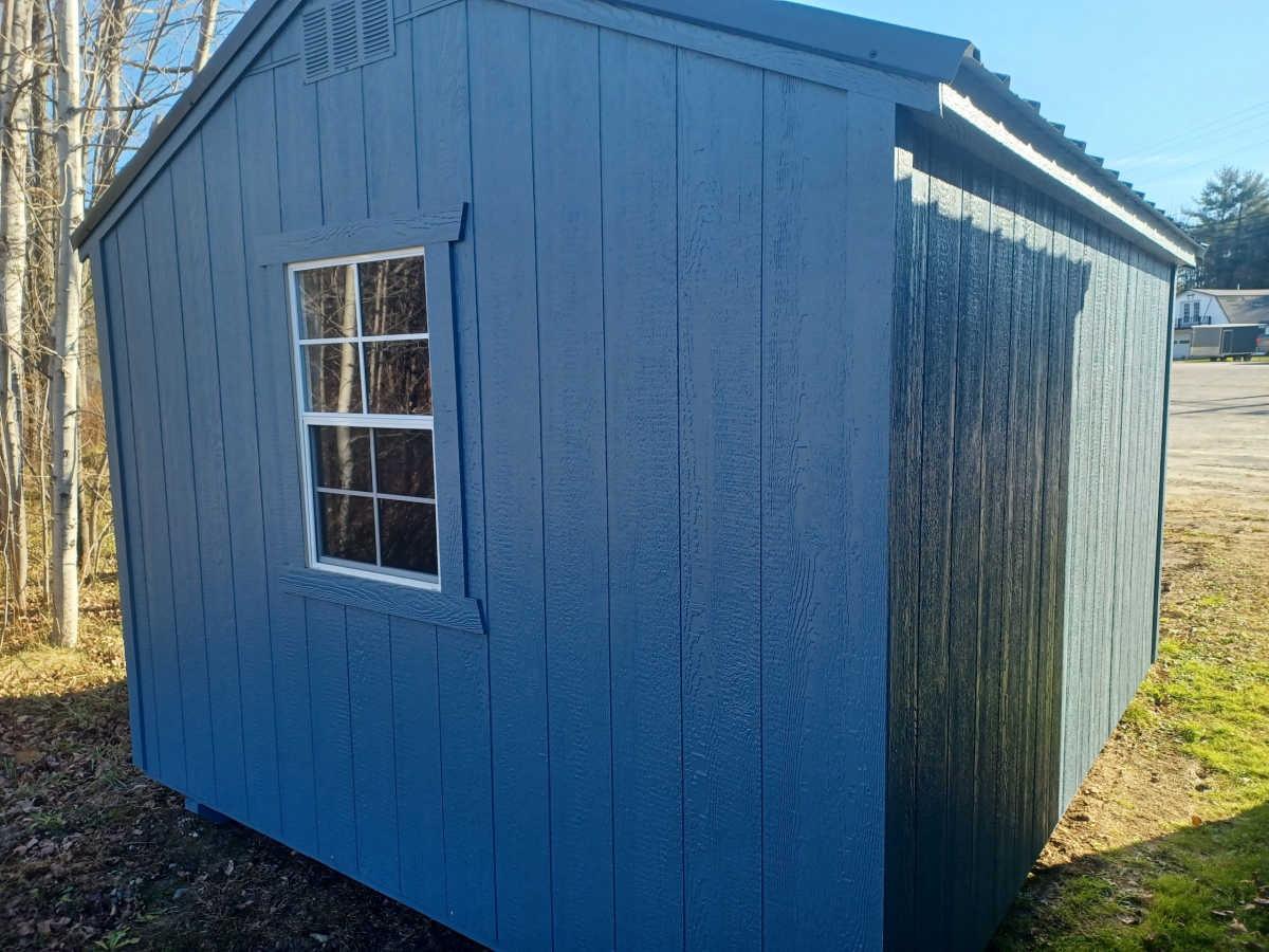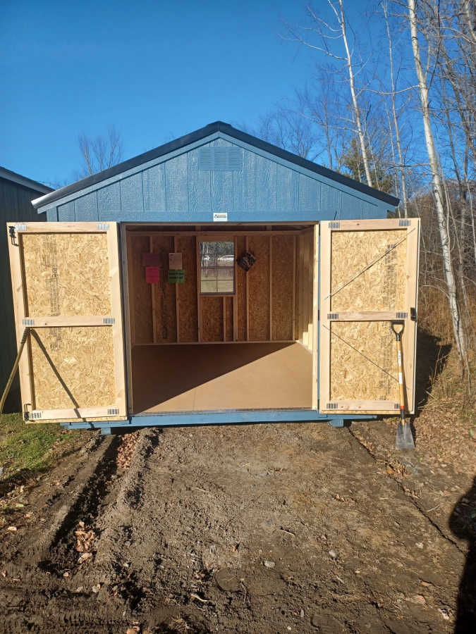 New 10x12 utility shed with metal roof, smart panel siding, double doors 2'x3' window, engineered floor, and diamond plate threshold.