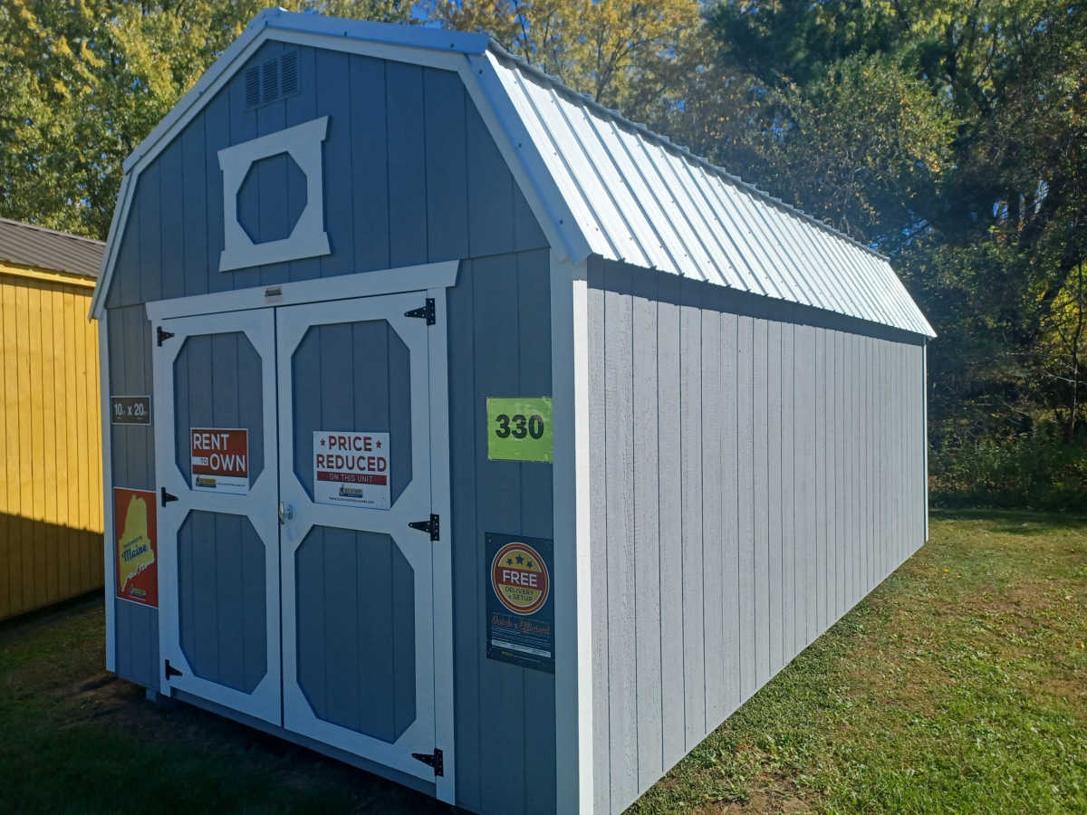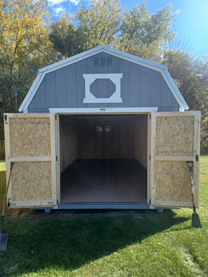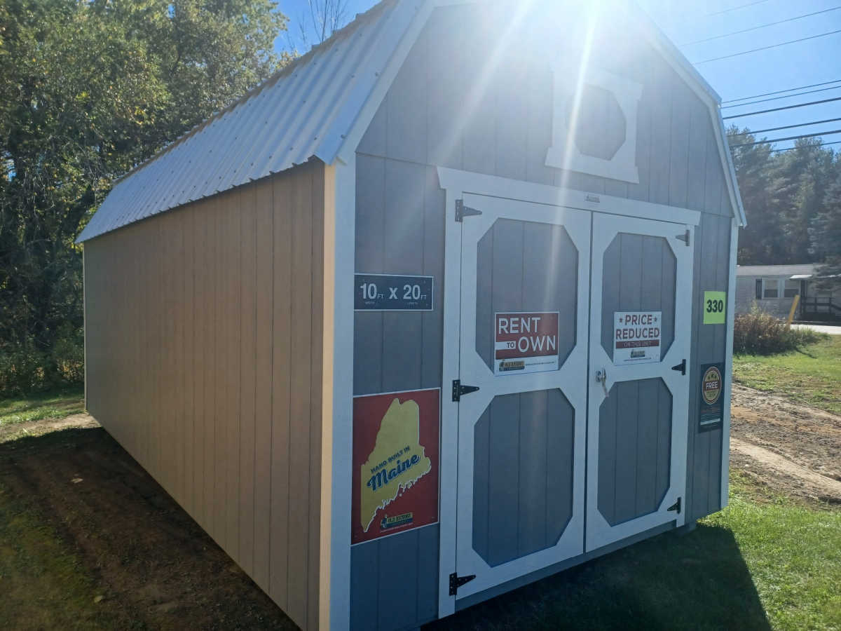 New 10x20 lofted barn with metal roof, smart panel exterior, double doors, engineered floor, and diamond plate threshold.