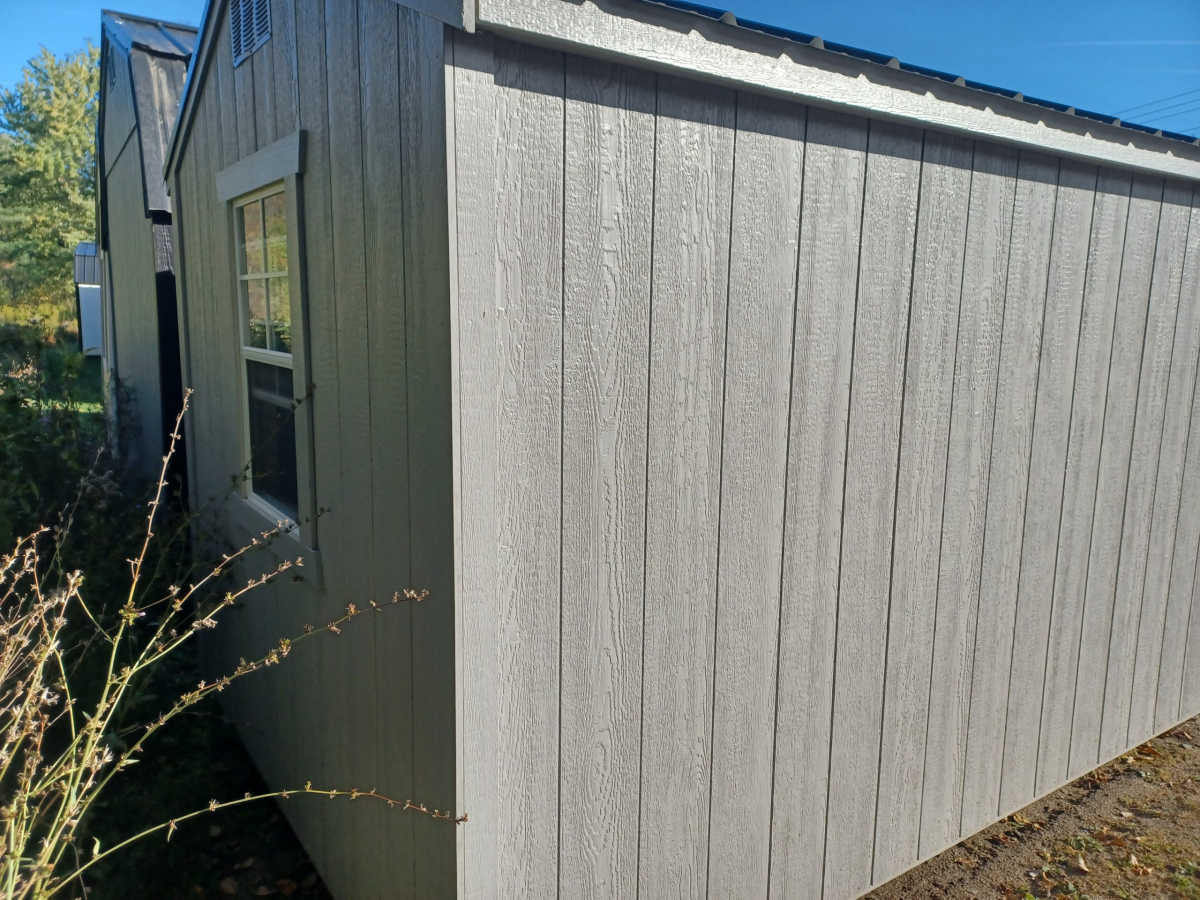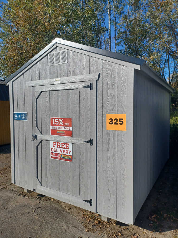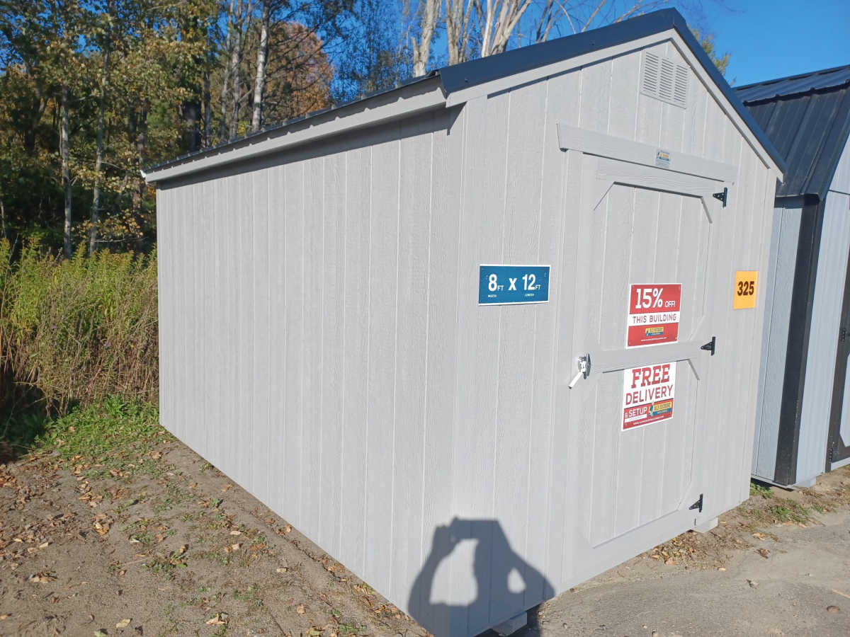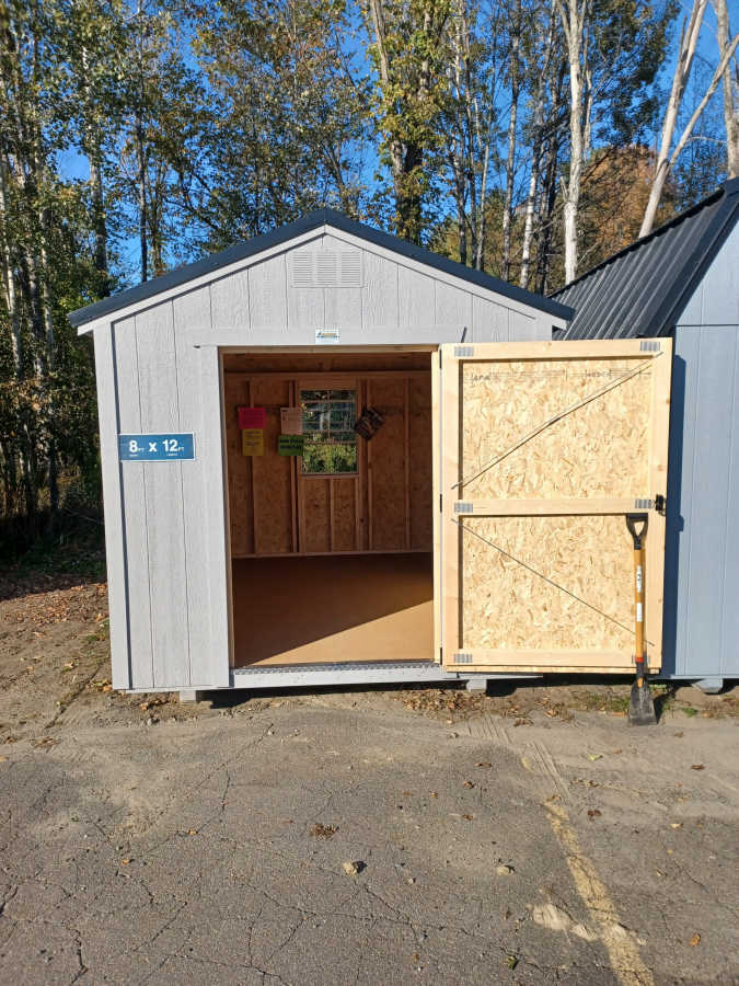 New 8x12 Utility shed with metal roof, smart panel siding, 6'3" walls, 2'x3' window, 4'x6' door, engineered floor, and diamond plate threshold.