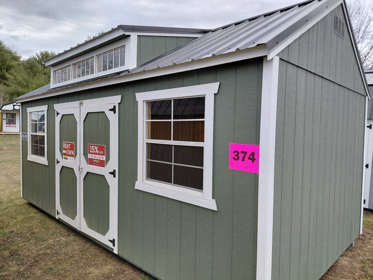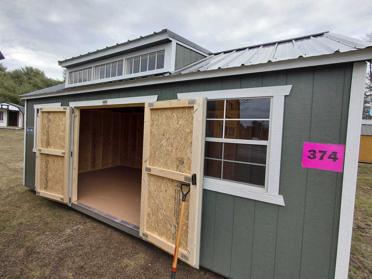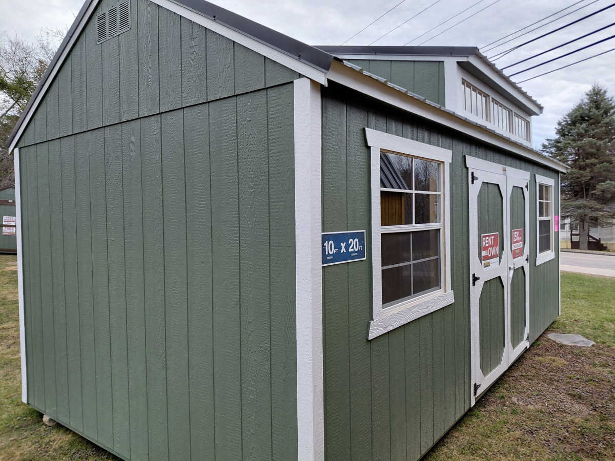 New 10x20 utility shed with dormer with metal roof, smart panel siding, dormer package with 3 10"x29" windows, 2 3'x3' windows, double doors, engineered floor, and diamond plate threshold.