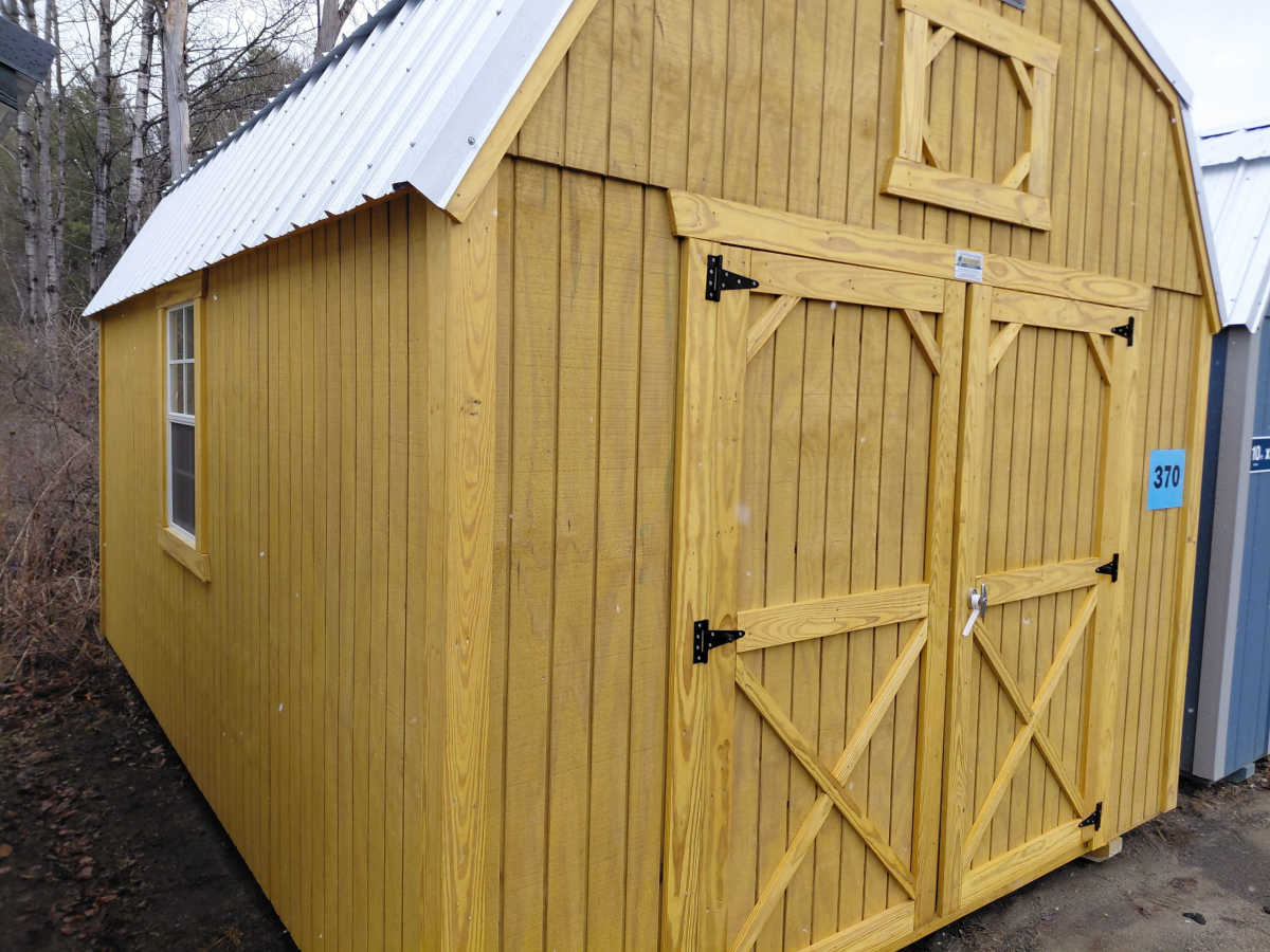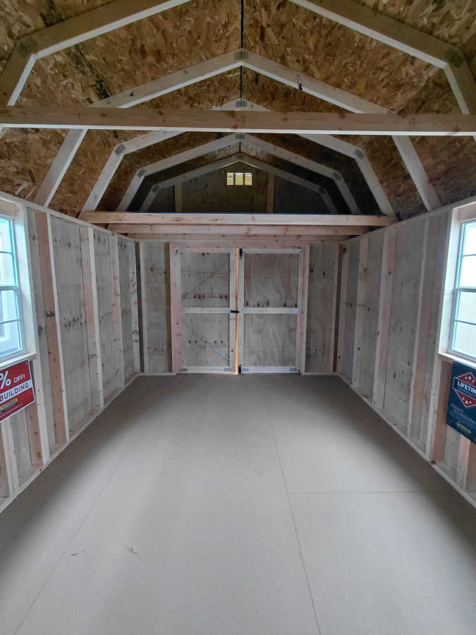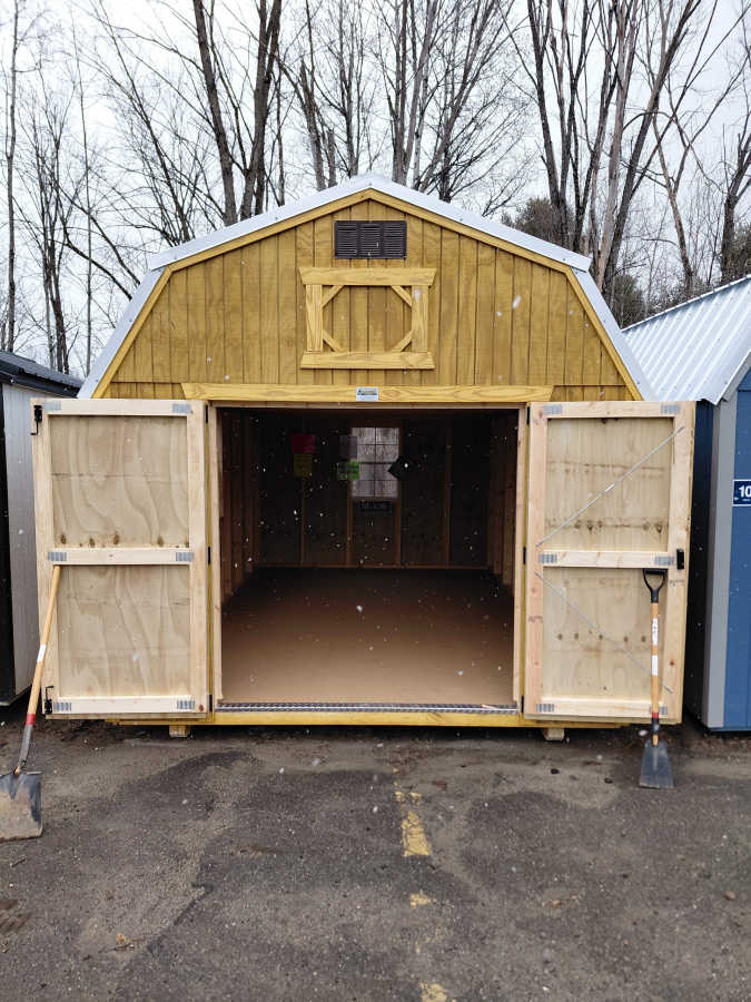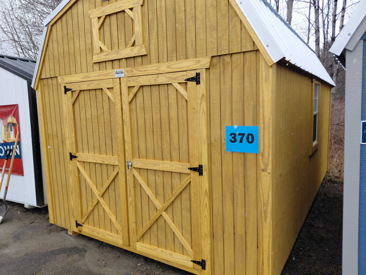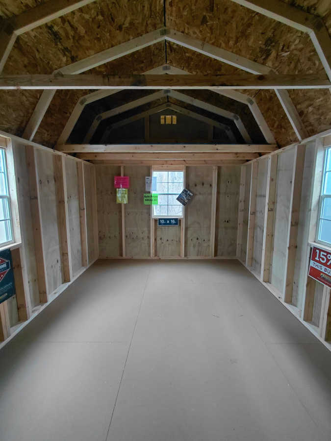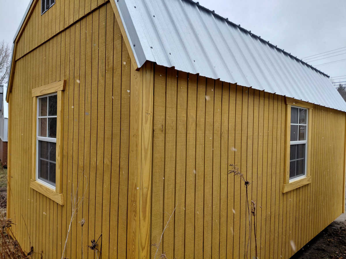 New 10x16 lofted barn with metal roof, smart panel siding, 3 2'x3' windows, double doors, 2 4' lofts, engineered floor, and diamond plate threshold.