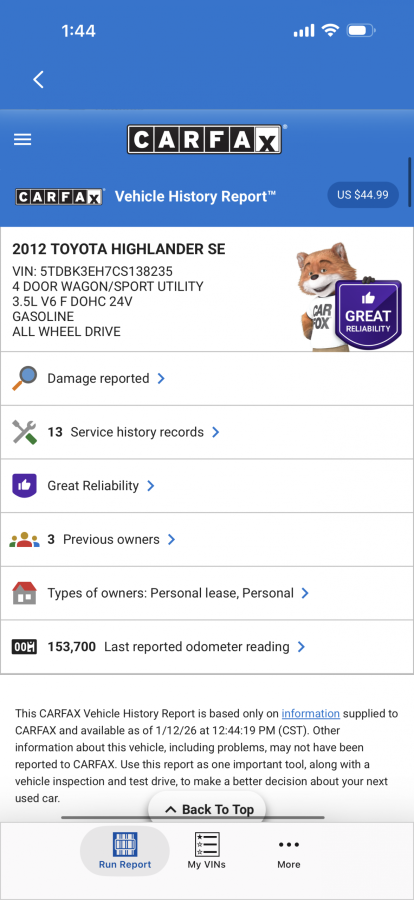 12 Toyota Highlander limited V6 all wheel drive automatic with 155K. Runs and drives great, needs nothing. All the struts and brakes were replaced recently. New inspection, 30 day plate and 30 day warranty. $7800 plus tax and title. No in house financing.