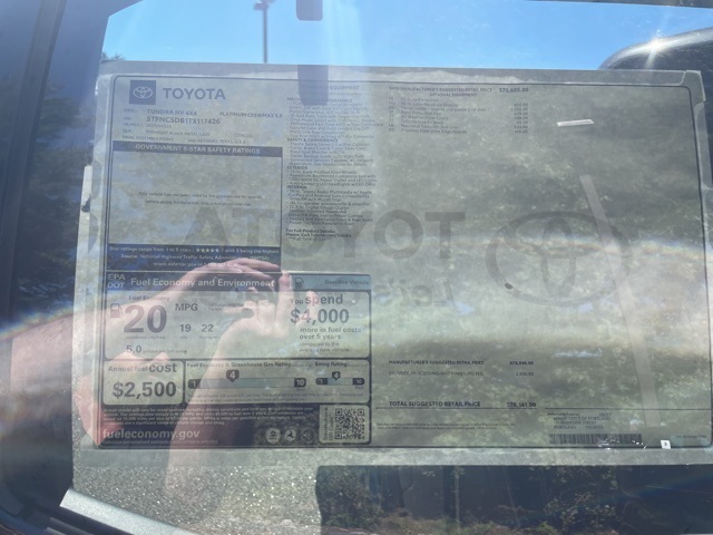 0218 2026 Toyota Tundra 4WD 10-Speed Automatic 3.4L V6This vehicle comes with Toyota Care complimentary 2 year and 25,000 mile vehicle maintenance at no charge. Warranty includes Basic Coverage 36 months/36,000 miles (all components other than normal wear and maintenance items). Powertrain Coverage1 60 months/60,000 miles (engine, transmission/transaxle, front-wheel-drive system, rear-wheel drive, seatbelts and airbags). Quoted price subject to change without notice to correct errors or omissions. All figures are estimates only and are not guaranteed as accurate. Dealer document processing charge of $799 not included in quoted price. Sales tax or other taxes, tag, title, registration fees, and government fees is not included in quoted price. All vehicles subject to prior sale.• At Berlin City Toyota of Portland you can buy with confidence knowing all of our certified vehicles undergo a rigorous reconditioning process and come with a 2 month/2,000 mile warranty. And if for any reason you are not fully satisfied with your purchase bring it back within 4 days or 200 miles, no questions asked. Want to save more time, we'll even deliver it to your doorstep within 24 hours. That’s how we make car buying easy. Quoted price subject to change without notice to correct errors or omissions. All figures are estimates only and are not guaranteed as accurate. Dealer document processing charge of $799 not included in quoted price. Sales tax or other taxes, tag, title, registration fees, and government fees is not included in quoted price. All vehicles subject to prior sale.
